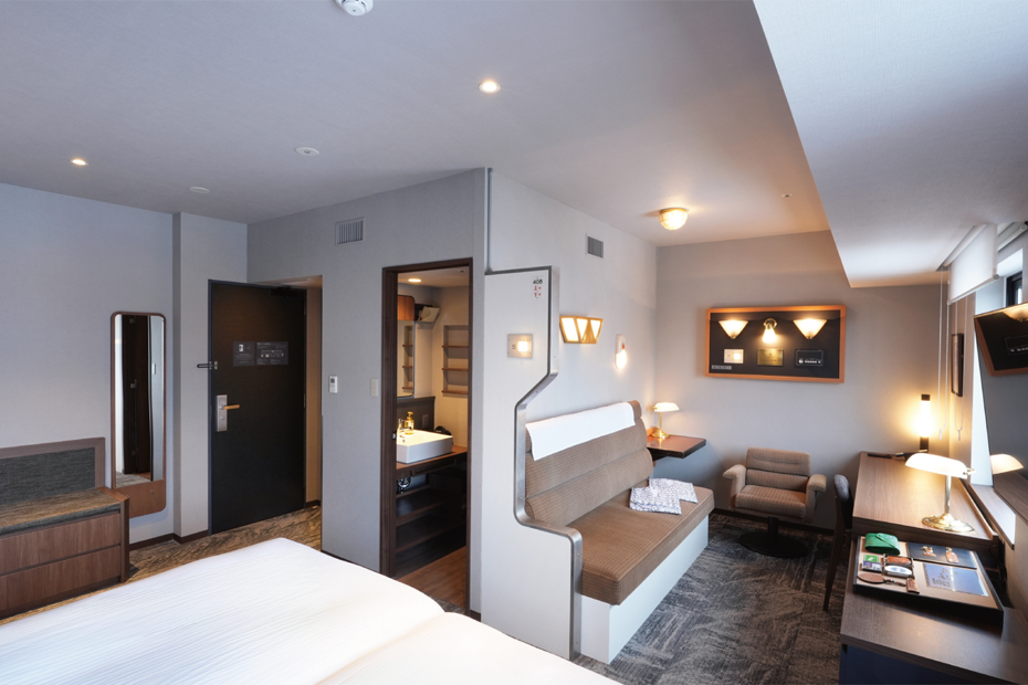 窓に広がる港町。旅情あふれるその景色は、駅を往来する列車を眺める「トレインビュー」と函館山・朝市を見晴らす「マウンテンビュー」。鉄道と、明治から昭和にかけて津軽海峡を行き交った「青函連絡船」の記憶を刻むホテルへ、ようこそ。